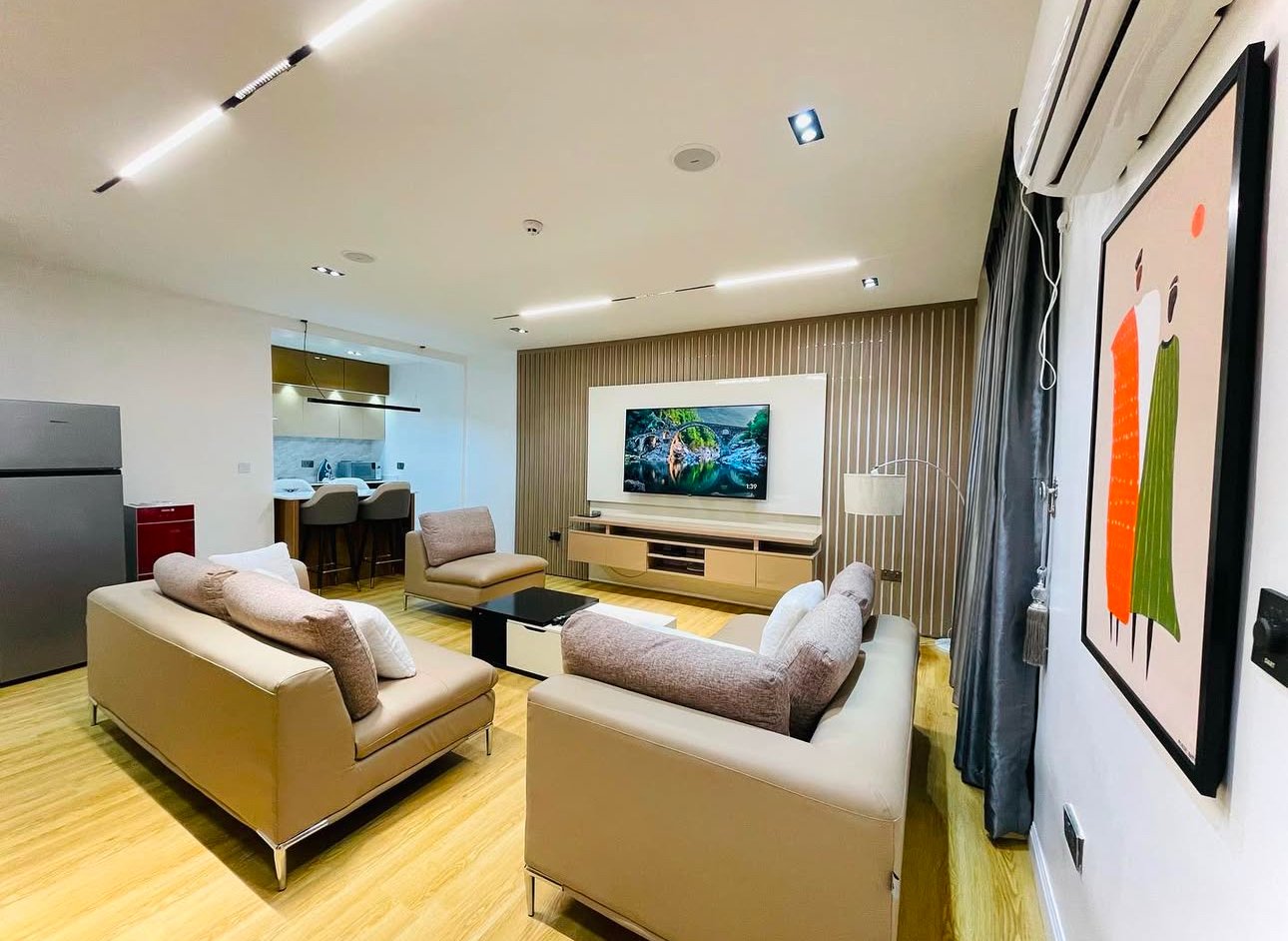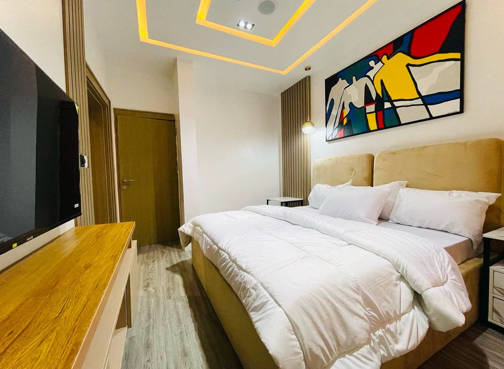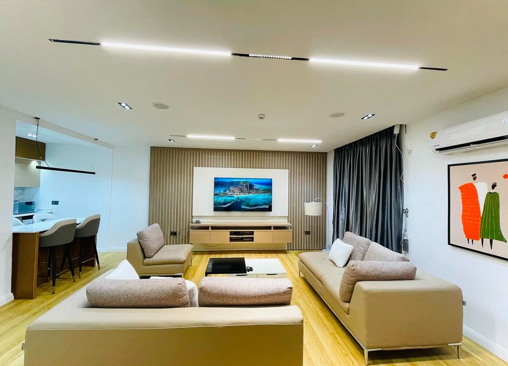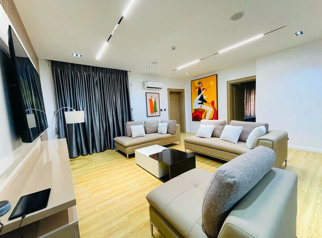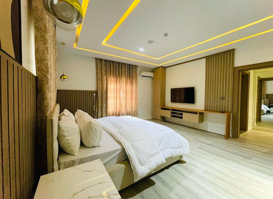 Experience refined comfort and modern luxury in this stylish 2-bedroom shortlet apartment located in the prestigious district of Maitama, Abuja. This smart apartment is thoughtfully designed to deliver a seamless living experience, featuring Alexa-enabled automation, 24/7 electricity, and a beautifully furnished living room that exudes contemporary elegance. Each bedroom is fully ensuite, offering privacy and comfort, while inbuilt speakers enhance your entertainment experience throughout the space. Guests enjoy complimentary breakfast, access to a fully equipped modern kitchen, and convenient amenities including a washing machine and super-fast internet connection. The apartment also boasts smart TVs, a serene swimming pool with an active heating system, and a secure gated compound with uniformed security personnel, ensuring both relaxation and peace of mind in a sophisticated environment tailored for both short and extended stays.